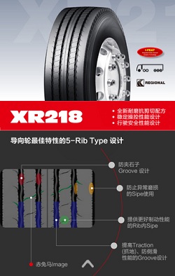 其中XR218采用全新耐磨抗剪切配方,更加穩(wěn)定的操控性能設(shè)計(jì),以及保障行駛安全性能設(shè)計(jì)。其導(dǎo)向輪采用了最佳特性的5—Rib Type設(shè)計(jì),包括防夾石子Groove設(shè)計(jì);防止異常磨損的Sipe使用;提供更好制動(dòng)性能的Rib內(nèi)Sipe;以及提高Traction(抓地)、防側(cè)滑性能的Groove設(shè)計(jì)。